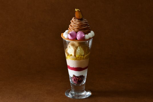 深まる秋の美しい色彩を表現した華やかな見た目に心ときめく限定のパフェです。トップはサクッとした食感のクッキーの上に芳醇な味わいのモンブランクリームをたっぷりと絞り、赤紫色のカシスメレンゲを添え、まるで貴婦人のような装いに仕上げました。グラスの中には上品な味わいのバニラアイスや栗の甘露煮、やさしい甘さのマロンムースや紅茶やカシスのソースを重ね、最後の締めくくりには、甘酸っぱいカシスクランチの食感をお楽しみいただけます。