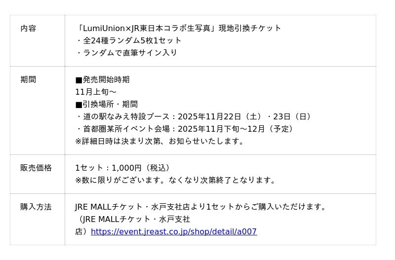 また、「LumiUnion」6周年を記念して、JR東日本の制服を着用した生写真の現地引換チケットを数量限定でJRE MALLで販売します。列車や駅、JRE MALLなど様々な場所で「推し活」をお楽しみください。