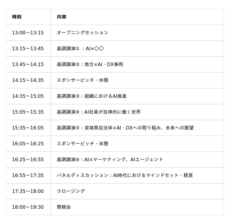 本イベントは、東北が直面する人口減少・少子高齢化の現実を受け止め、AIを「未来を再設計するための武器」として地域課題に挑む“決起集会”です。