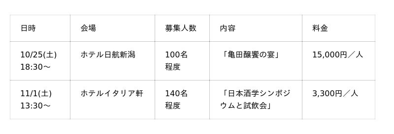 ■ 市内のホテルや旅館などを会場に、新潟清酒と地元食材とのペアリングや、伝統文化・伝統芸能などを体験できます。■ 来年2月末まで、約10のイベントを開催随時予定!現在募集中のイベントは下記の通りですが、様々な内容で楽しめるイベントを企画中です。個別イベントの詳細は、決まり次第、特設サイトでお知らせします!