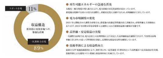 本ファンドの収益は、一次調整力市場での高単価契約を主軸 (約89%)とし、スポット市場取引(約11%)で補完する安定的な二本立て構造です。さらに将来的には容量市場への参入も計画しており、多様な収益源を確保していきます。 電力系統の脱炭素化が進む現在、系統用蓄電池の市場需要は今後10年で10倍以上に拡大すると予測されており、 先行者利益を確保できる有望な投資機会となっています。