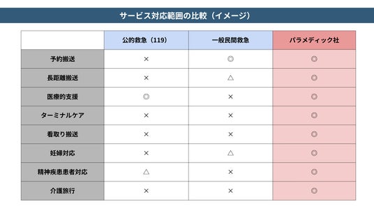 パラメディック社の市場での独自性は、医療特化型搬送サービスの確立にあり、上記表のとおり、予約搬送、長距離搬送、医療的支援、ターミナルケア、看取り搬送、妊婦対応、精神疾患患者対応、介護旅行など、幅広いニーズに対応できる体制を整えています。