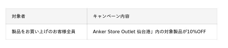 この度オープンを記念し、2025年10月23日(木)~ 2025年11月3日(月・祝)の12日間限定で「Anker Store Outlet 仙台港」内の対象製品を10%OFFでご購入いただけるキャンペーンを実施します。