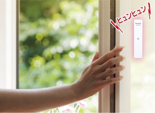 窓が開いたことをお知らせしてくれる開閉センサー。窓が開けられると報知音*(ヒュンヒュンヒュン)が鳴動します。連携可能なドアホンや電話機と連動させて、どこの窓が開いたかをお知らせします。別の部屋にいながら窓の開閉を教えてくれるので、万が一の時にも通報する時間を作ることができます。