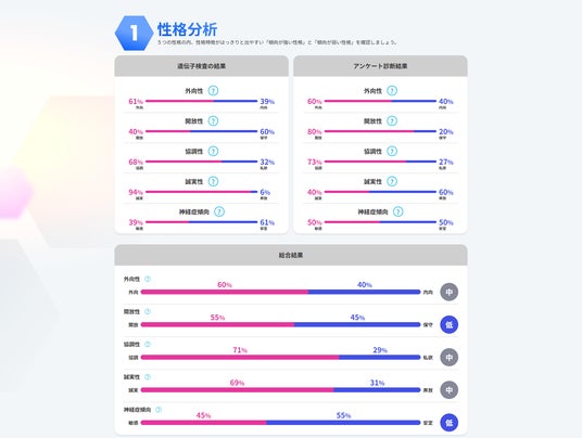 ・「自分を知っている人は遺伝的に外向性と開放性が100%だと思うと思いますが、遺伝的には外向性47%・開放性35%でした。現在の結果は外向性100%だったので、遺伝子的に無理しているかもと気づけた」