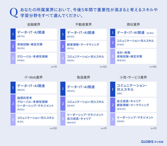 - 今後5年間で重要性が増すスキル、5業界で「データ・IT・AI関連」が最多回答に