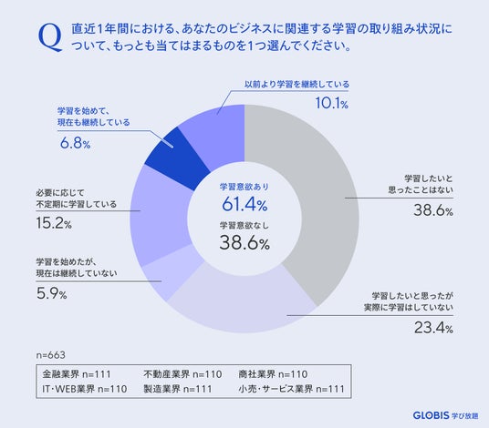 株式会社グロービス(本社:東京都千代田区、代表取締役:堀義人 以下「グロービス」)が提供する定額制動画学習サービス「GLOBIS 学び放題」は、20代~50代のビジネスパーソンを対象に、金融業界、不動産業界、商社業界、IT・Web業界、製造業界、小売・サービス業界における学習ニーズに関する実態調査を実施しました。
