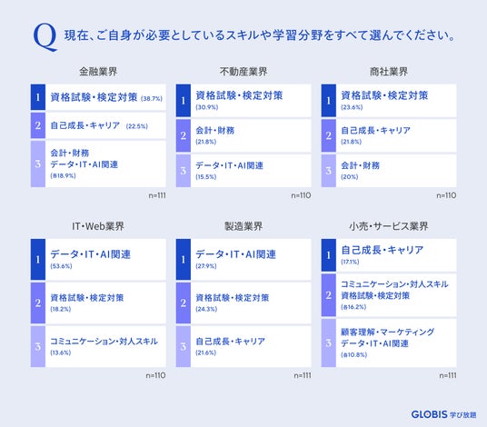 こうした状況を踏まえ、GLOBIS 学び放題は、金融業界、不動産業界、商社業界、IT・Web業界、製造業界、小売・サービス業界の6業界のビジネスパーソンを対象に調査を実施しました。各業界のビジネスパーソンの現状および今後必要とされるスキルを明らかにすることで、ビジネスパーソンが学びの一歩を踏み出すきっかけを提供することを目指します。