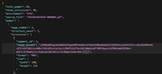 全ての抽出された画像は、Base64形式(画像を64種類の印字可能な英数字(アルファベットの大小文字、数字、+、/)に変換するエンコード方式)でエンコードされ、JSON(JavaScript Object Notation)形式のテキストデータとして出力されます(図2)。
