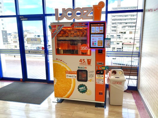 シャンピアポート2Fに設置された350円生搾りオレンジジュース自販機IJOOZ