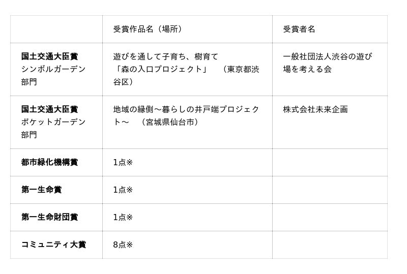 ※都市緑化機構賞、第一生命賞、第一生命財団賞、コミュニティ大賞の受賞作品、各作品の詳細はプレスリリース資料をご覧ください。