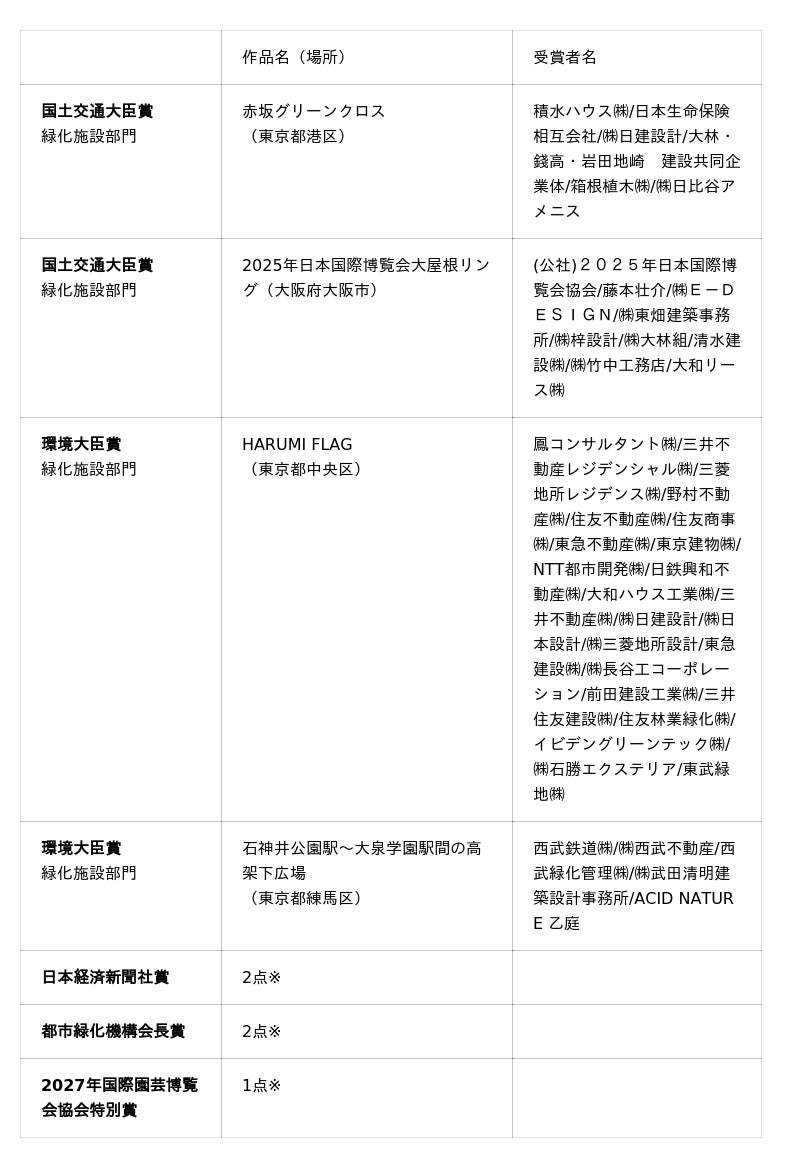 ※日本経済新聞社賞、都市緑化機構会長賞、2027年国際園芸博覧会協会特別賞の受賞作品、各賞の詳細はプレスリリース資料をご覧ください。