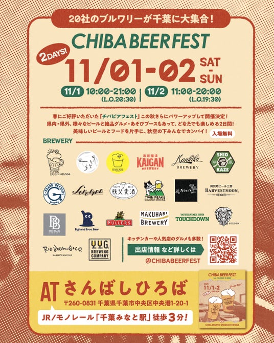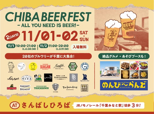 春に大好評を博したチバビアフェストがこの秋さらにパワーアップ。今回は20社のブルワリーが参加し、個性豊かなクラフトビールが勢ぞろい。絶品グルメや楽しいあそびブースも登場。どなたでも楽しめる2日間です。