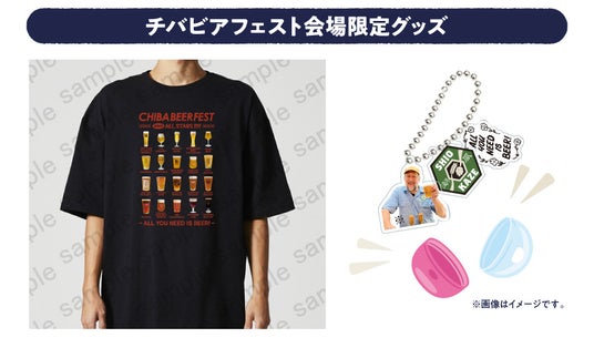 『ランダムアクリルキーホルダー(ガチャガチャ)』や、 チバビアフェスト限定デザインの『ビッグシルエットTシャツ』など、カンパイ気分を盛り上げるアイテムが揃います。