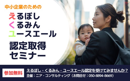 ニア・コンサルティング株式会社(本社:福島県福島市、代表:佐藤 巨人)は、「中小企業のための えるぼし・くるみん・ユースエールの認定取得セミナー」を開催します。少子高齢化や労働力不足といった社会的な問題解決を促進するため、企業が女性活躍、子育て支援、若者雇用を推進するための取り組みを評価し、認定する制度である「えるぼし・くるみん・ユースエール」。認定を受けることで、企業イメージの向上のほか、さまざまなメリットが受けられます。多くの中小企業が取得を目指すこれらの制度について理解するためのセミナーです。