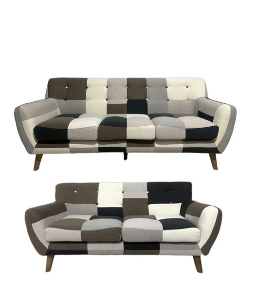 カラフルでありながらも落ち着いたトーンレトロでモダンな雰囲気が魅力のパッチワークソファ。木脚付きで北欧スタイルにも馴染みます。お部屋のアクセントに。