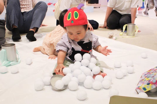 「PLAY! ART! BABY!」は、0~2歳を対象とした、体験型アートのワークショップです。エリック・カールの絵本をもとに、3ヶ月ごとにテーマを変えて開催。色・形・音・光・感触など、多様な素材を使いながら、五感を使ってアートを楽しみます。