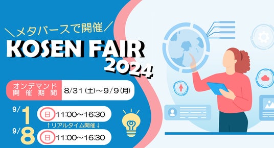 独立行政法人国立高等専門学校機構(東京都八王子市 理事長:谷口功 以下「高専機構」)は、国立高専の入試情報や高専で学べること、学校生活のリアルなどをより知りたいという方へ向けて、2024年8月31日(土)~9月9日(月)の期間中、メタバース空間上にてKOSEN FAIR 2024(国立高専合同説明会)を開催します。(個別相談等のリアルタイムでの企画は9月1日(日)、9月8日(日)に開催!)