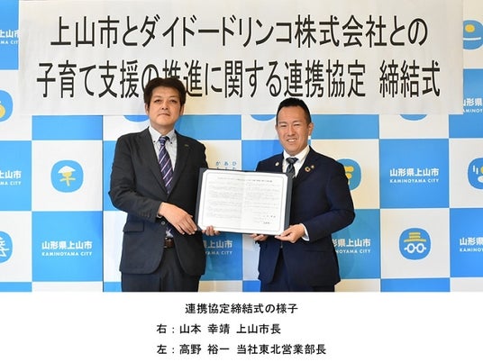 ダイドードリンコ株式会社(本社:大阪市北区、代表取締役社長:中島 孝徳)は、山形県上山市(以下「同市」)と同市の「上山市こども計画」の実現推進を目的とした子育て支援の推進に関する連携協定(以下「本連携協定」)を、10月22日(水)に締結しましたので、お知らせいたします。