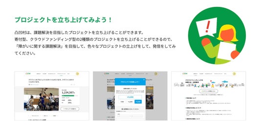 凸凹村は、障がい者限定のWEBコミュニティプラットフォームも立ち上げを行っています。自身で「村」の立ち上げができ、障がいに対する課題解決に向けてプロジェクトの立ち上げや、クラウドファンディングの立ち上げをすることが可能です。クラウドファンディング手数料は5%と、どこよりも良心的な利率設定としており、障がい者の課題解決を応援してまいります。