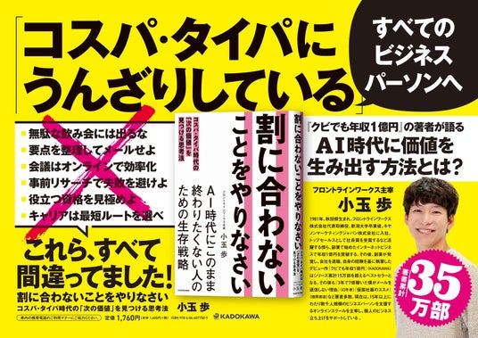 株式会社KADOKAWA(本社:東京都千代田区、取締役代表執行役社長 CEO:夏野剛)は、2025年10月2日(木)に刊行した小玉歩氏の最新刊『割に合わないことをやりなさい コスパ・タイパ時代の「次の価値」を見つける思考法』が、発売からわずか2週間で8,000部の増刷を決定したことをお知らせいたします。これにより、累計発行部数は15,000部となりました。