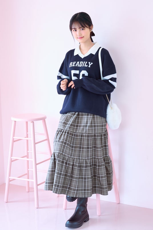 ネイビーで魅せる、キャッチーでスポーティなデザインのニット。原菜乃華さんのコラボカラー“ネイビー”が、カジュアルなムードに品の良さを添え、冬のコーディネートをきゅっと引き締めます。合わせやすさと存在感のバランスがよく、毎日の着こなしに自然と溶け込む一枚です。