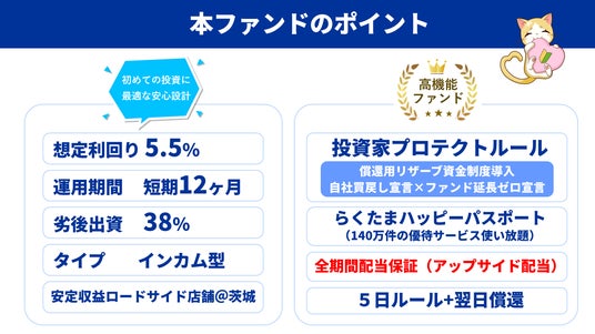 『らくたま』は、不動産クラウドファンディングをより安心で身近な資産形成の手段としてお届けするために誕生しました。私たちは安全性と透明性を常に重視し、堅実なファンド設計と多彩な特典プログラムを通じて、従来の「投資=堅い・難しい」という固定観念を取り払い、誰もが1万円から参加できる新しい投資体験を提供してまいります。信頼に支えられた資産運用を楽しみながら、以下の特典もぜひご体験ください。