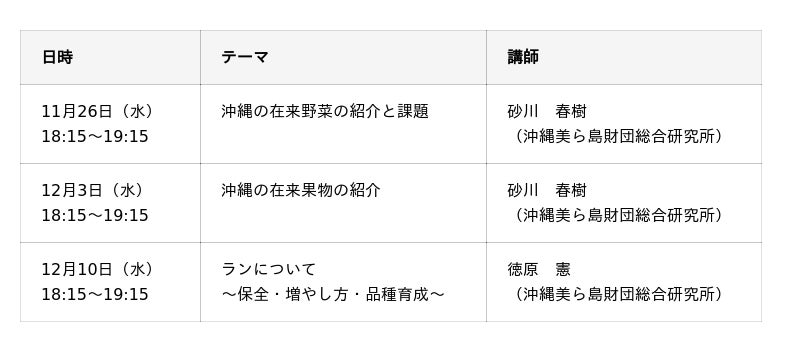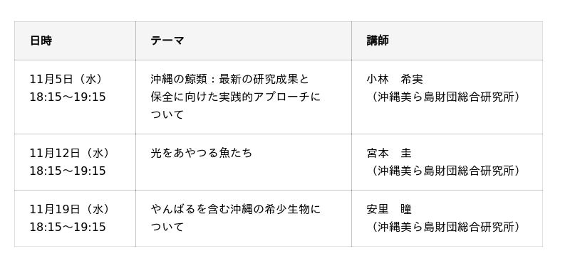 沖縄美ら島財団では、令和7年度名桜大学公開講座(シリーズ講座)において、「沖縄の歴史文化」「沖縄の動物」「沖縄の植物」「沖縄の博物館」の4つのカテゴリーで、研究者による分かりやすい解説を実施いたします。