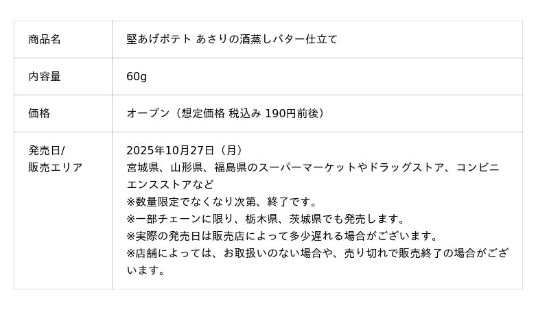 カルビー株式会社(本社:東京都千代田区、代表取締役社長兼CEO:江原 信、以下カルビー)は、福島県とコラボレーションした新商品『堅あげポテト あさりの酒蒸しバター仕立て』を、2025年10月27日(月)から宮城県、山形県、福島県で数量限定発売※します。本商品は、福島県と連携した地域課題の解決を目指すプロジェクトの第3弾。今回は、福島県の末廣酒造株式会社(本社:福島県会津若松市、代表取締役社長:新城 大輝、以下末廣酒造)の純米酒「あまいすえひろ」とのペアリング向けの特別な「堅あげポテト」です。カルビーは今後も、魅力的なお酒と商品のペアリングを通して、新しいスナック菓子の食べ方やお酒の飲み方を発信してまいります。