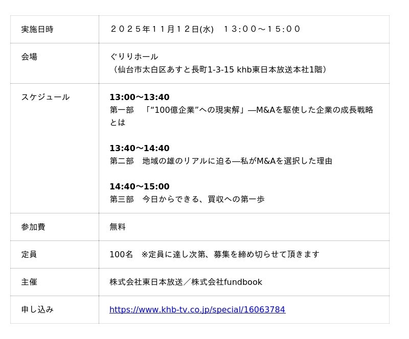 株式会社東日本放送(本社・仙台市太白区)は、企業のM&A・資本提携のアドバイザリー業務を行う株式会社fundbook(本社・東京都港区)と共に、宮城県の地域経済の中核を担う企業の成長を後押しすることを目的とした経営セミナーを、11月12日(水)にkhb東日本放送本社1階・ぐりりホールにて開催します。本セミナーではデジタル化による地方創生の推進をミッションとしたパブリテック事業を展開する株式会社チェンジホールディングス代表取締役兼執行役員社長の福留大士氏による基調講演をはじめ、宮城県で戦略的にM&Aを活用している株式会社カネサ藤原屋代表取締役社長佐藤正宗氏をお迎えし、企業成長のリアルと地域経済へもたらす効果について紐解きます。