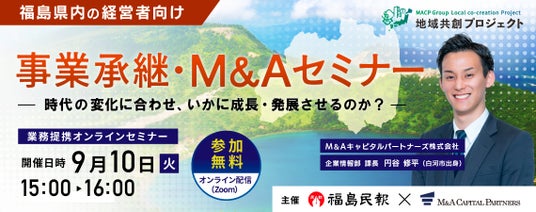 今回は、福島民報社との業務提携記念セミナーとして、福島県内の経営者向けに「事業承継の選択肢のひとつであるM&A」についての理解が深まるお話をさせていただきます。