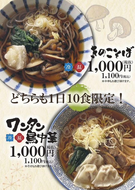 福島県大玉村で山形肉そばを提供する「そば八」(所在地:福島県安達郡大玉村大山中江264-1、PLANT-5大玉店駐車場内)は、2025年10月27日(月)から、新メニュー「きのこそば」と「ワンタン鳥中華」を販売いたします。