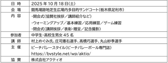 総合建設機械レンタルの株式会社アクティオ(本社:東京都中央区日本橋、代表取締役社長兼COO:小沼直人、以下アクティオ)は、ビーチバレースタイルが主催する、部活動でビーチバレーボールに取り組む中・高校生を対象にしたイベント「AKTIO アンダーエイジ・ビーチバレーボール・アカデミー」に冠協賛をしております。今回で12回目となるアカデミーを2025年10月18日(土)に栃木県足利市の競馬場跡地芝生広場内多目的サンドコートで開催いたしました。