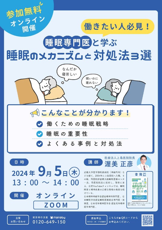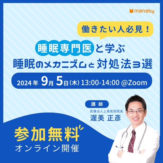 就労支援事業を行う株式会社manaby(本社:宮城県仙台市、代表取締役社長:岡崎 衛)は、無料オンラインセミナー「睡眠専門医と学ぶ 睡眠のメカニズムと対処法3選」を開催します。