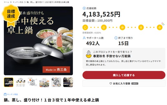 多くの応援が集まった注目企画、『鍋、蒸し、盛り付け!1台3役で1年中使える卓上鍋』プロジェクトが歴代応援額1位を更新いたしました。