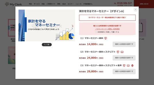 マイクラークでは、多くのFPの皆さまのマネーセミナーに関するお悩みを解消するを為に、始めやす い・伝わりやすい マネーセミナー資料の販売を開始することを決定いたしました。