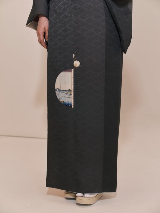 浮世絵きもの のぞき椿と隅田川江戸時代、庶民の娯楽として親しまれた浮世絵をもとにデザインしたきもの。江戸の名所・隅田川を描いた浮世絵柄を、きものと八掛(裏地)に配しました。波柄の地模様が映えるポリエステル生地を使用しています。