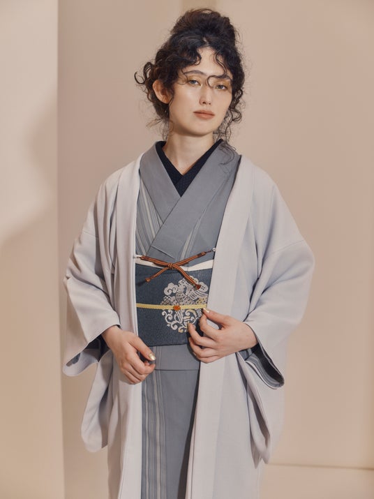 江戸らしい白鼠色のきものに、色小物を差して粋な着こなしに。