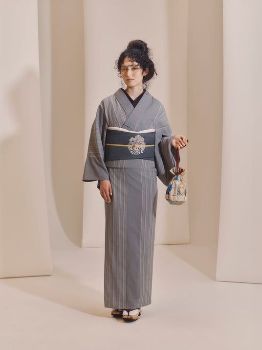 きもの:片貝木綿 矢鱈縞無地 白鼠 58,300 円(税込/手仕上ミシン仕立付)