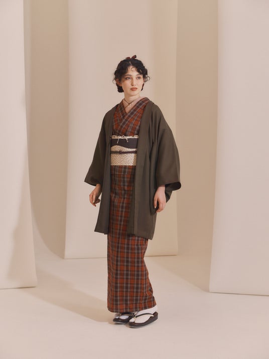 新潟県小千谷市・片貝町でつくられる木綿のきもの。二筋格子と三筋格子を重ねた奥行きのある格子柄。鮮やかな海老色のきものに、茶や抹茶色を重ねて、かわいらしくも江戸らしい装いに仕上げました。