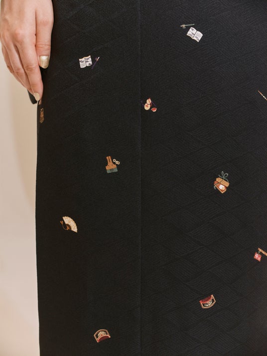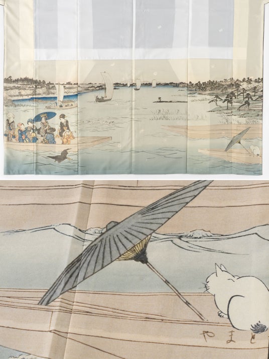 八掛とは、きものの裾回りに付ける裏地のことです。今季の江戸シリーズのきもの(浮世絵きもの「のぞき椿と隅田川」、小紋「旅道具と隅田川」)には、隅田川を描いた浮世絵柄の八掛を合わせています。裾には船旅を楽しむ猫の姿を忍ばせ、遊び心を添えています。