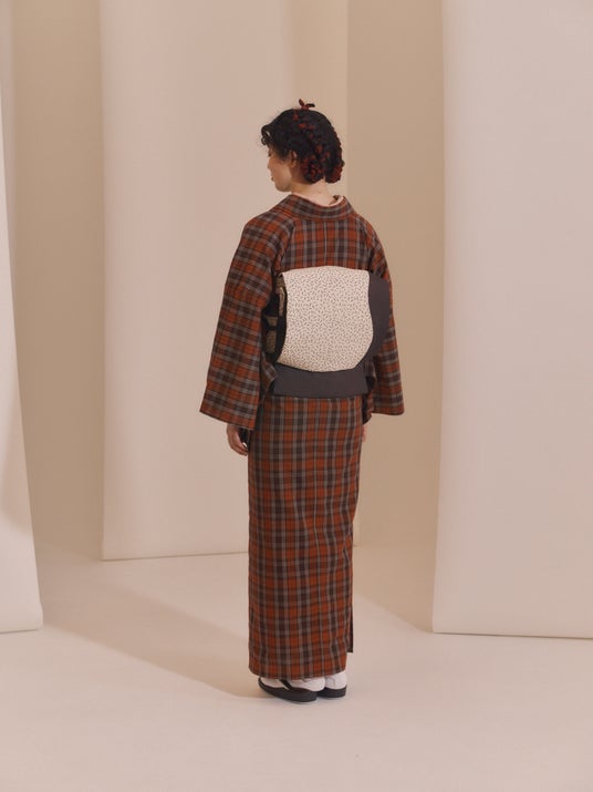 きもの:片貝木綿 格子 海老茶 58,300円(税込/手仕上ミシン仕立付)