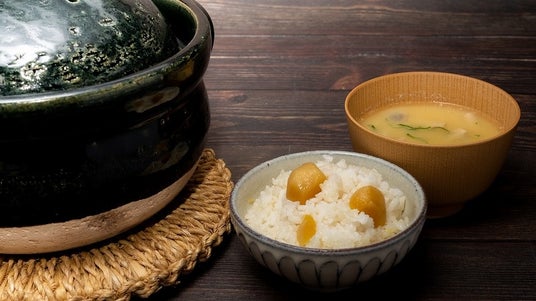 お釜で炊き上げる栗ごはん、きのこと豆乳の味噌仕立て、お漬物