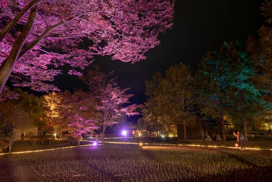 秋の夜長、温かな光に包まれた古民家と木々を眺めながら、園内をのんびり散策してみませんか。夜間は冷えますので暖かい服装でお越しください。皆さまのご来場をお待ちしています。