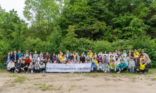 ▲2025年度は、前年度・第12回「ミツバチ一の枚画コンクール」への応募作品数21,973本を含む41,931本の植樹を実施しています。(2025年10月現在)