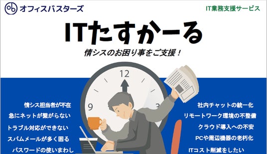株式会社オフィスバスターズ(東京都千代田区、代表取締役社長:熊谷 正慶<東京証券取引所 TOKYO PRO Market 証券コード:5890>、以下「当社」)は、企業のIT運用・管理をサポートする定額制サービス「ITたすかーる」を本格展開いたします。本サービスは、社内に情報システム(情シス)担当者が不在、または兼任で負担が大きい中小企業を対象に、月額39,900円から、PCヘルプデスク、Microsoft 365運用支援、セキュリティ対策、定期訪問などをワンストップで提供。「オフィスに自分専属のIT担当がいるような安心感」を実現します。