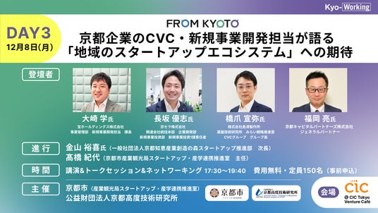 事業会社が社外のスタートアップに対して投資を行うCVC(Corporate Venture Capital)については、投資リターンはもとより、投資先との協業や買収による自社サービスの強化など、事業シナジー創出につながる事例が増えている。本イベントでは、京都企業のCVC・新規事業開発担当が自社の取組を紹介するとともに、「地域のスタートアップエコシステムに期待すること」について語る。