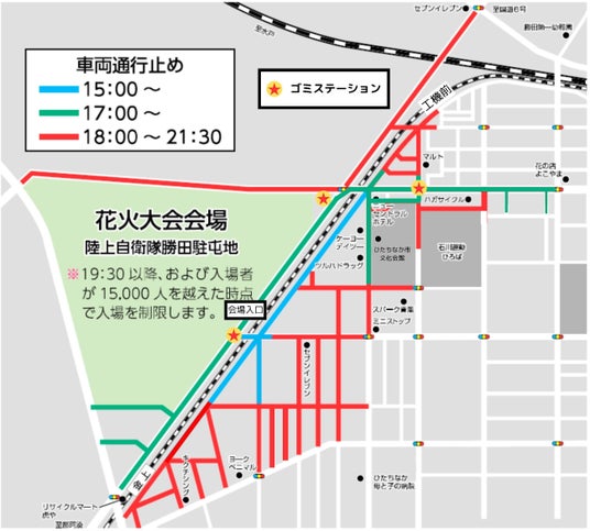 8月17日(土)15:00より、一部道路・地区にて車両通行止めの交通規制が実施されます。また、19:30以降およびドローンショー・花火大会会場への入場者が15,000人を超えた時点で入場制限が実行されます。会場と周辺の安全確保が難しいと主催者が判断した場合、ドローンショーおよび花火大会が中止となる可能性もあります。