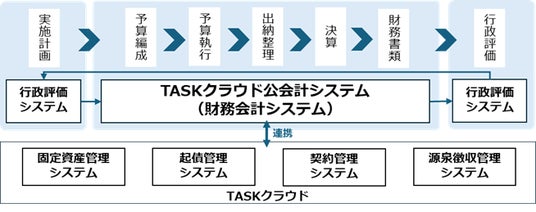 TASKクラウド公会計システムは、地方公会計一体型の財務会計システム(クラウドサービス)です。関連サービスとの連携により、実施計画から予算編成・執行、決算・財務書類の作成、評価、活用まで“一気通貫”で処理でき、業務の効率化を支援します。