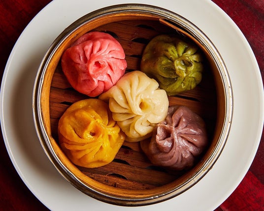 当店自慢の「五色小籠包」!「エビ(ピンク)」「豚肉(白)」「フカヒレ(オレンジ)」「鶏肉(緑)」「牛肉(紫)」と五種類の味が楽しめます!色鮮やかな小籠包は写真映え間違いなし。一度は食べて頂きたい一品です。